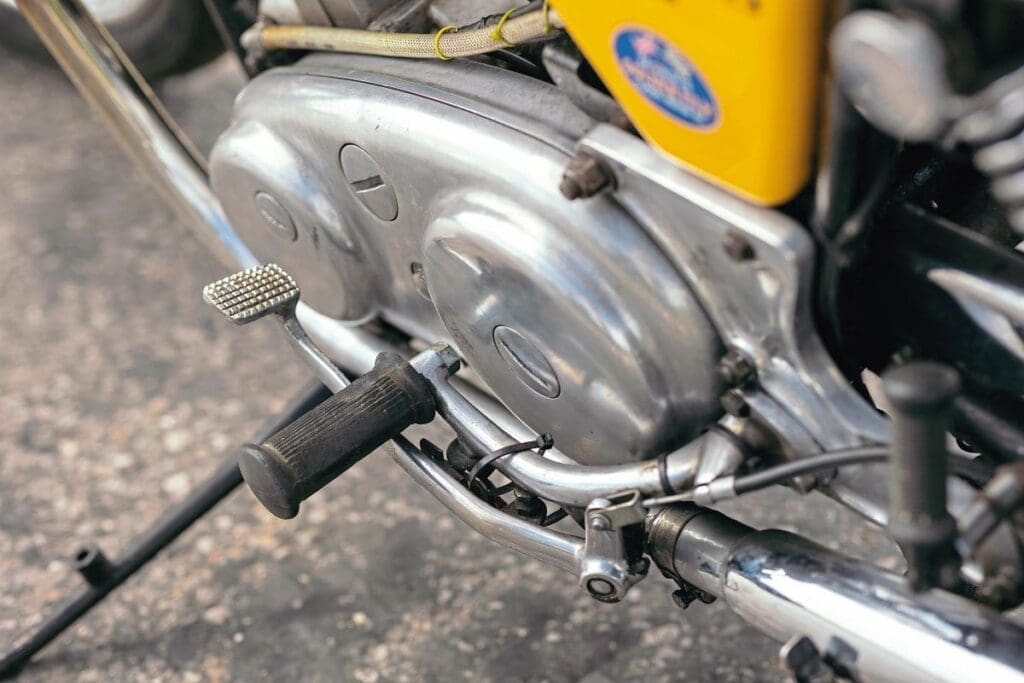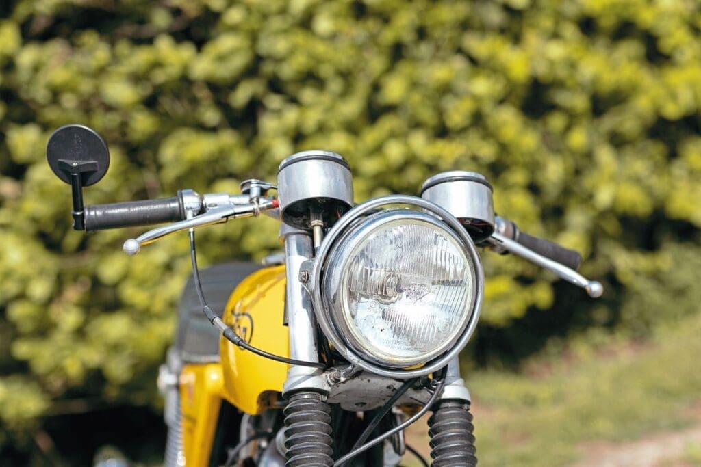 The minimal 2¼ Imperial gallon gas tank, with a ‘Monza’ filler cap and a ‘Curly N’ transfer, crowned a lean machine. A ribbed conventional dualseat complemented it. In another part of what the training shoe industry calls “implied performance”, the chrome headlamp shell was surrounded by a chromed ‘protector ring’, to which could be clamped a mesh stone-guard – though how many ‘S’ riders went seriously off-road is debatable. But they looked as if they could. A truncated rear chainguard and plated footrest hangers continued the shiny theme.