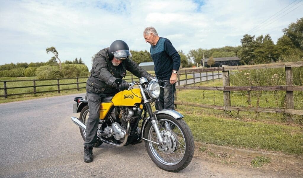 It was time for us to try the bike, and George advised not to change into top before 50, and added that the clutch was “a bit sharp…” So it proved to be, to my embarrassment. The bike fired up for George with a wonderful roar, first kick every time – “I never use the choke” – but when I mounted and went to move off, the Norton stalled. This happened three times, and it was no consolation to recall that editor James had recently suffered something similar, though with a much older machine.