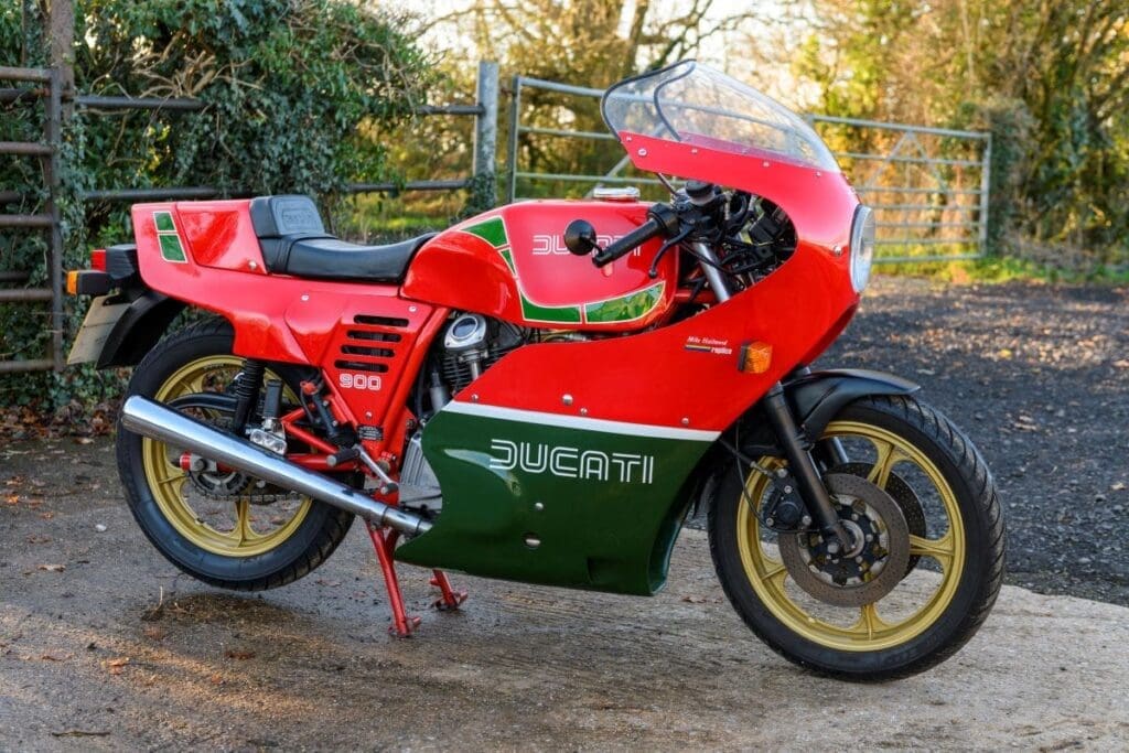 1985 Ducati Mike Hailwood Replica – A stunning homage to Mike Hailwood’s legendary Isle of Man TT comeback victory in 1978. This rare and meticulously maintained bike comes from a private collection and features its signature red, green, and white livery, along with performance components like Campagnolo wheels and Brembo brakes.
