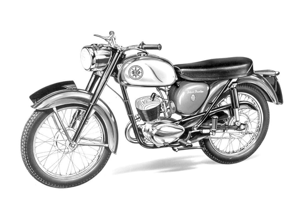 The glamour model. 173cc engine with alloy outer cover, hydraulically damped forks borrowed from the Tiger Cub, headlamp nacelle. Chrome tank panels and pear-drop badges from 1961. Economy ‘Silver Bantam’ in final year.